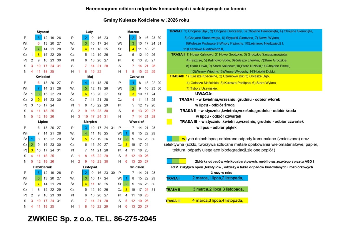 Harmonogram oraz więcej informacji dostępne są na stronie internetowej Gminy Kulesze Kościelne www.kuleszek.pl oraz na stronie ZWKiEC Sp. z o.o. lub pod nr tel. (86) 275 20 45, tel. kom. 512 024 282.