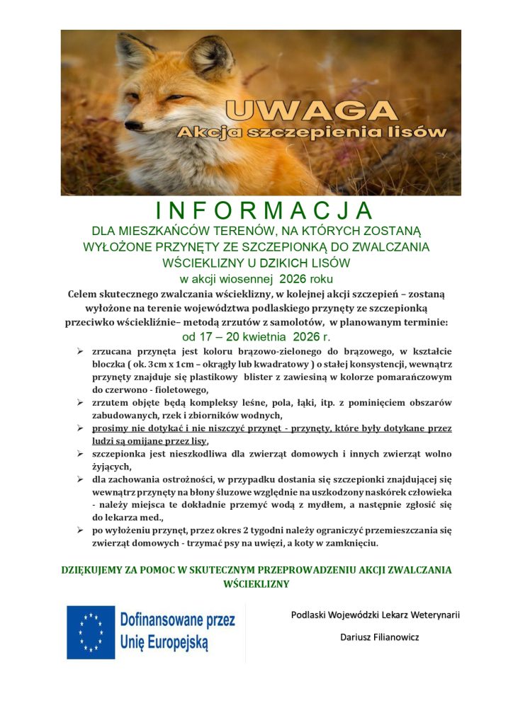 I N F O R M A C J A DLA MIESZKAŃCÓW TERENÓW, NA KTÓRYCH ZOSTANĄ WYŁOŻONE PRZYNĘTY ZE SZCZEPIONKĄ DO ZWALCZANIA WŚCIEKLIZNY U DZIKICH LISÓW w akcji wiosennej 2026 roku