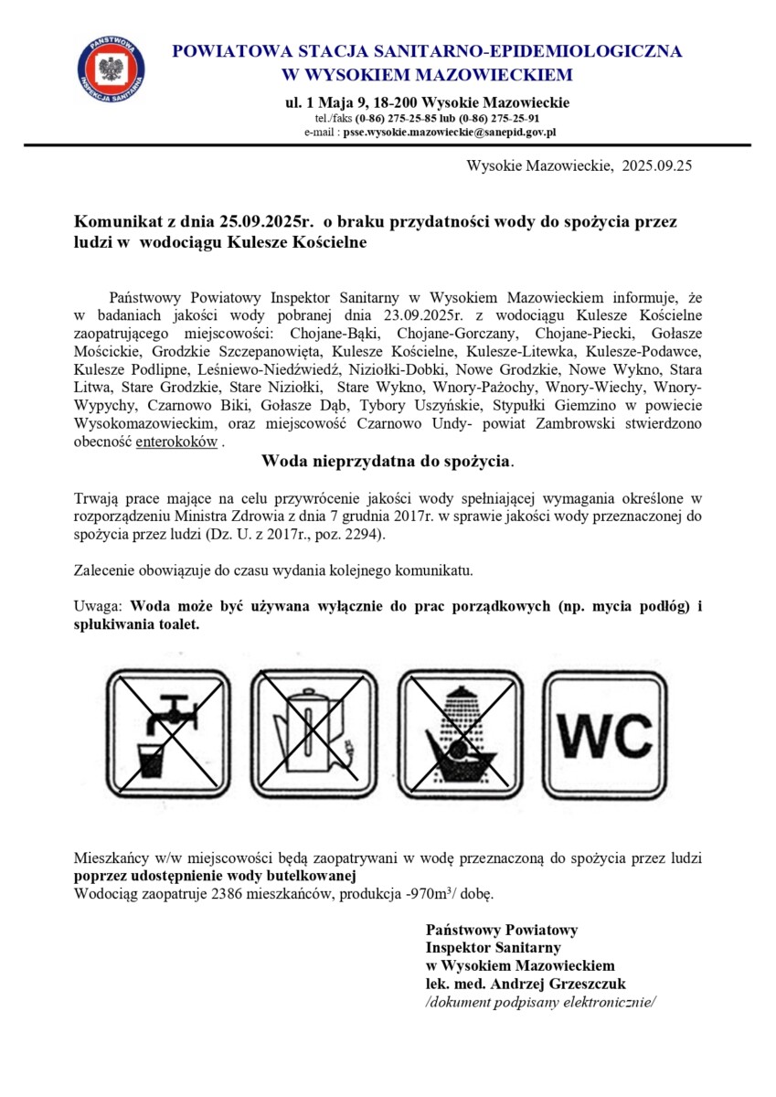 Komunikat z dnia 25.09.2025r. o braku przydatności wody do spożycia przez ludzi w wodociągu Kulesze Kościelne