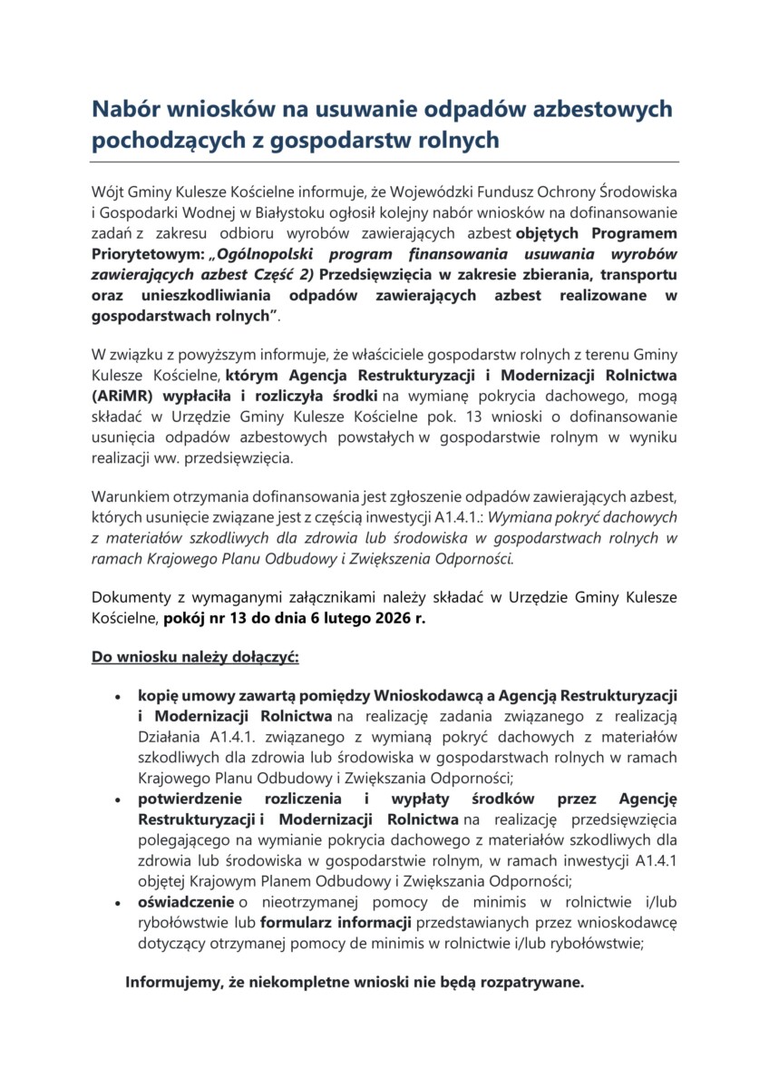 Nabór wniosków na usuwanie odpadów azbestowych pochodzących z gospodarstw rolnych, którym Agencja Restrukturyzacji i Modernizacji Rolnictwa (ARiMR) wypłaciła i rozliczyła środki