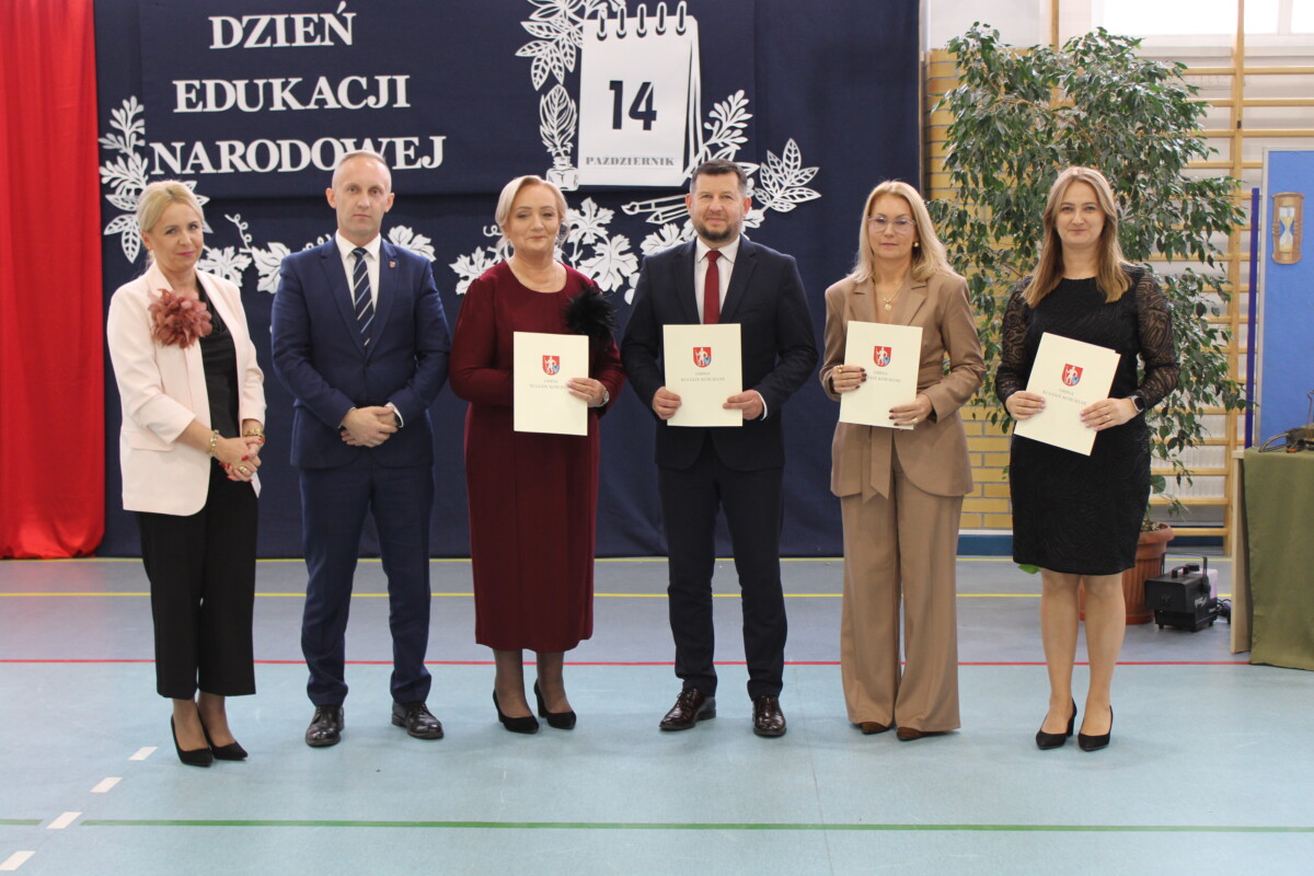 Mężczyzna w garniturze przemawia z mównicy podczas uroczystości Dnia Edukacji Narodowej w sali sportowej, z dekoracjami w kolorach polskiej flagi w tle.