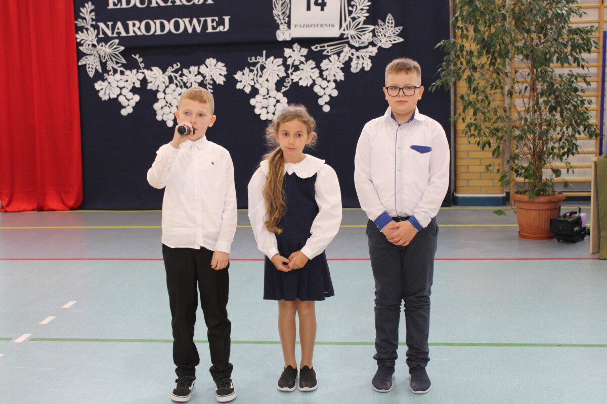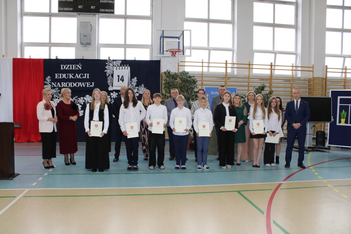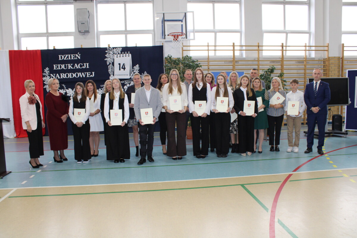 Uczestnicy uroczystości Dnia Edukacji Narodowej w hali sportowej, z mową wygłaszaną przez prelegenta przy prezencji uczniów w białych koszulach, dekoracjami i planszami edukacyjnymi w tle.
