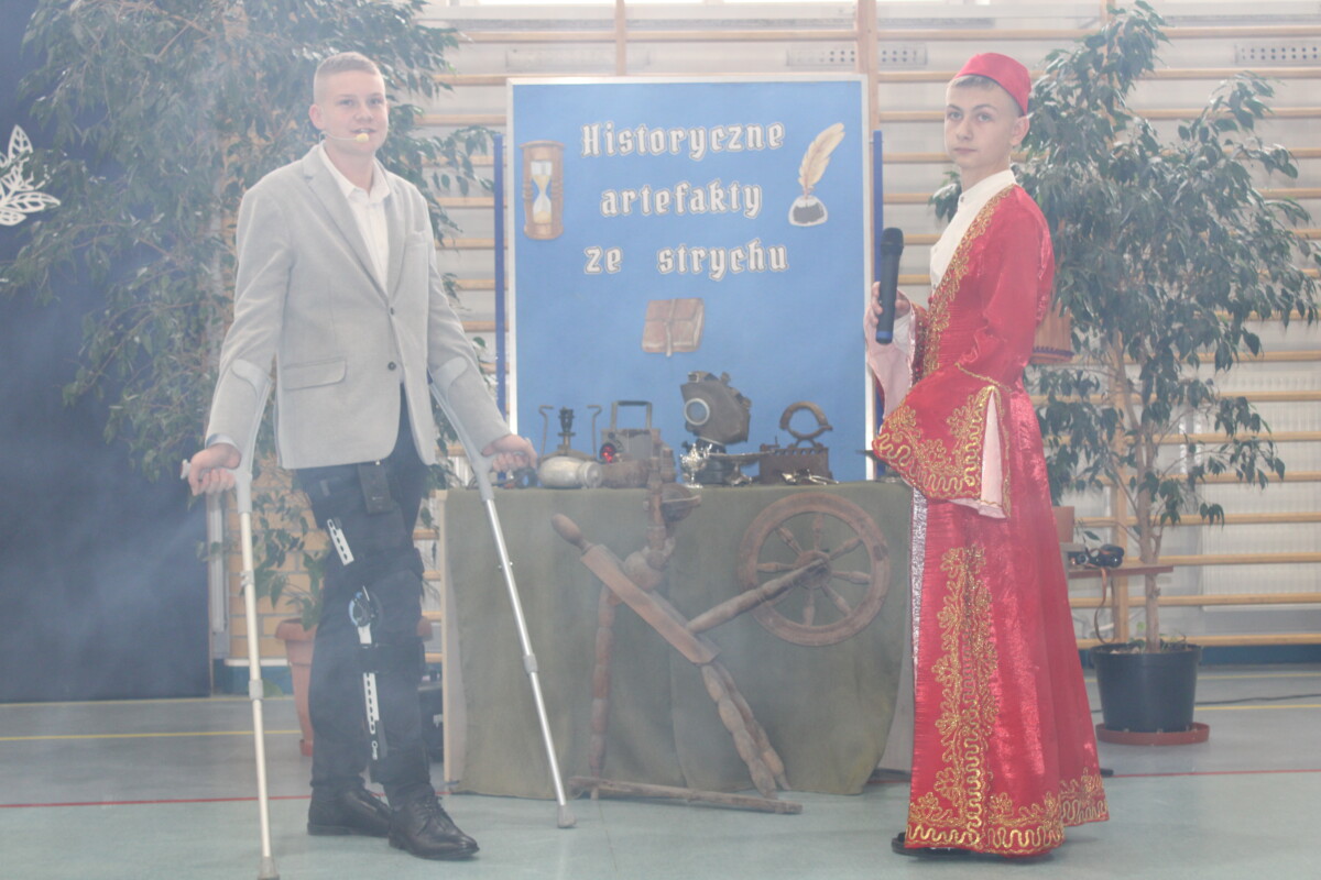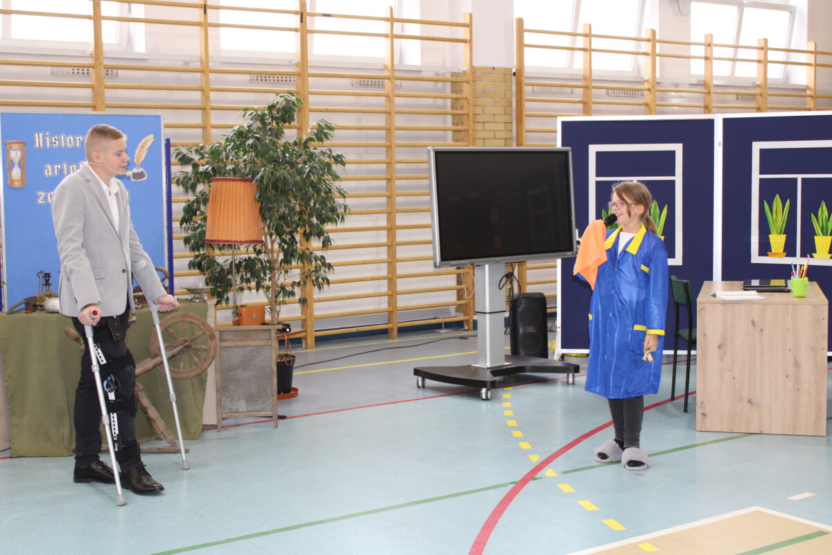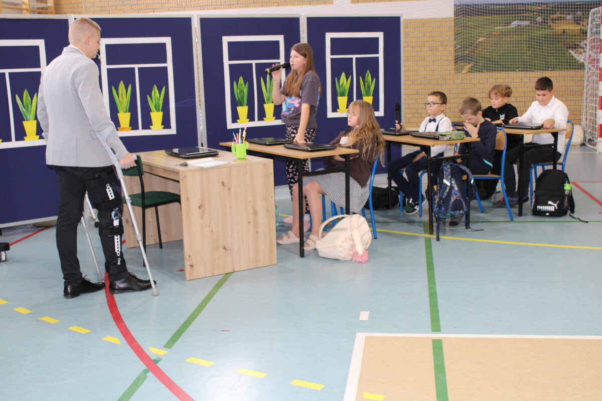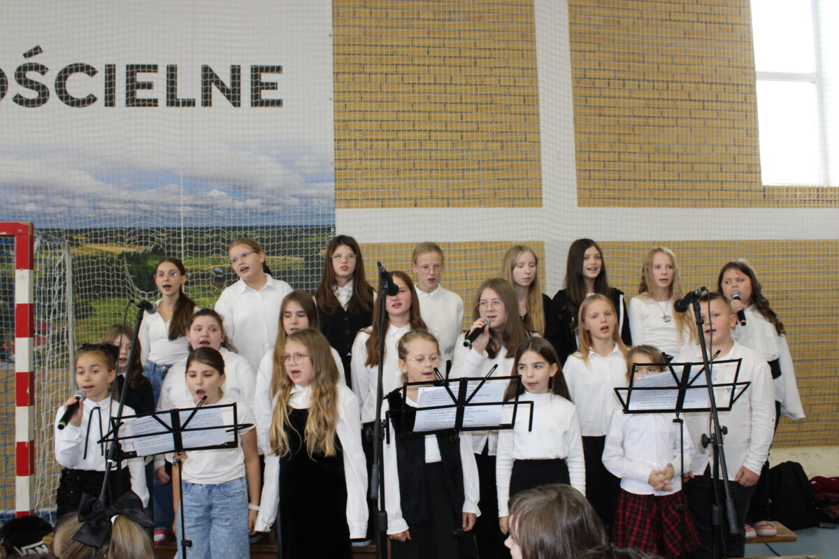 Uczestnicy uroczystości Dnia Edukacji Narodowej w hali sportowej, z mową wygłaszaną przez prelegenta przy prezencji uczniów w białych koszulach, dekoracjami i planszami edukacyjnymi w tle.