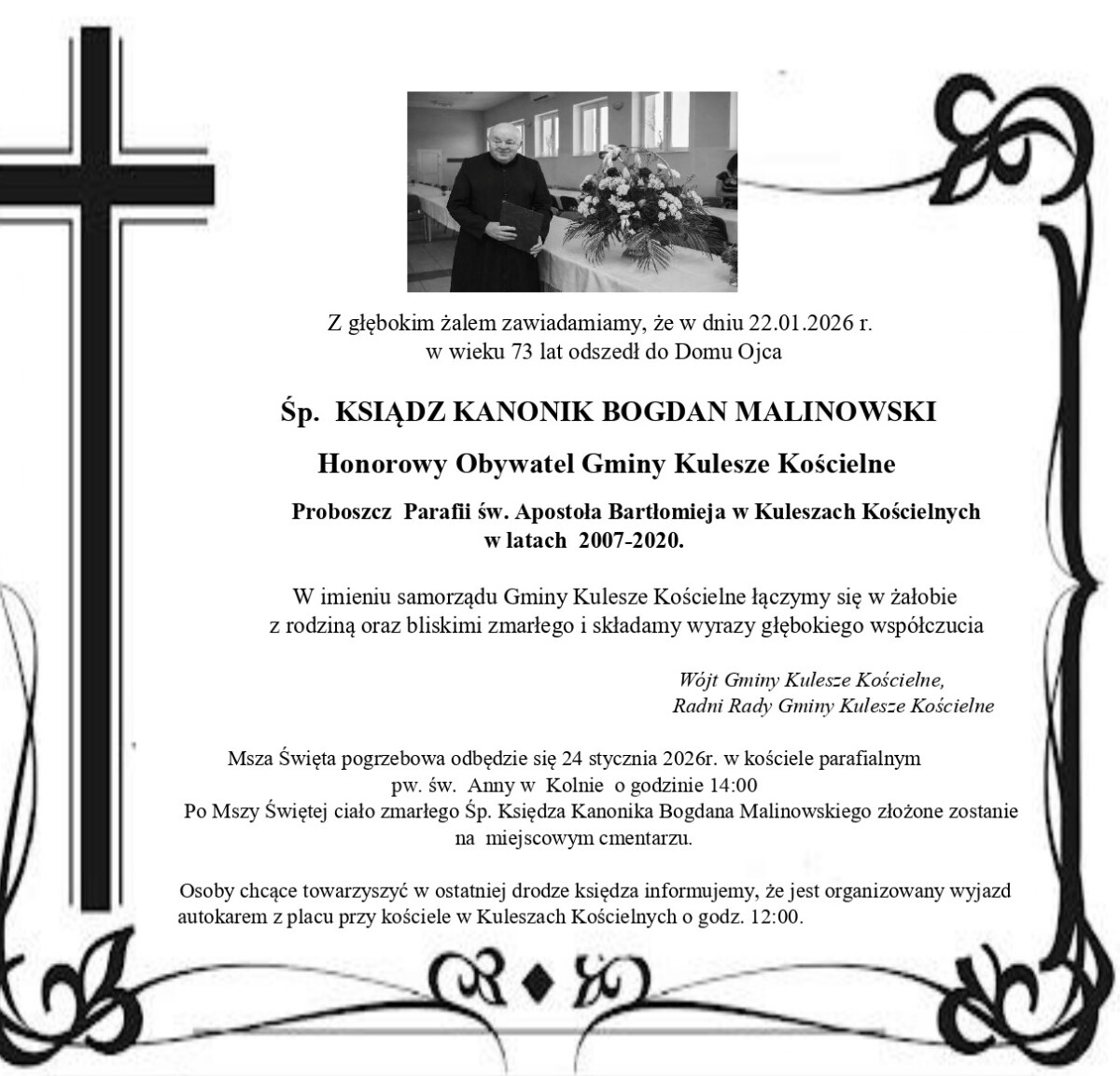 Z głębokim żalem zawiadamiamy, że w dniu 22.01.2026r. w wieku 73 lat odszedł do Domu Ojca Śp. KSIĄDZ KANONIK BOGDAN MALINOWSKI